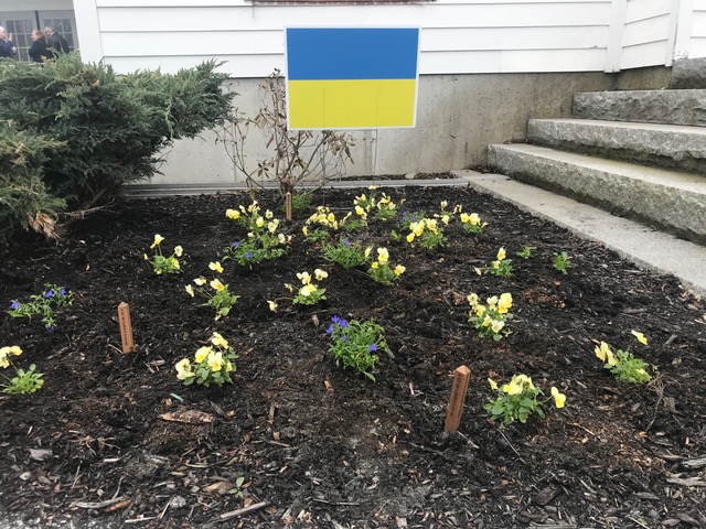 On Easter Sunday we planted our garden for 2022. We decided to make it a Peace Garden as a visible reminder of our wish for peace in the world. The flag of Ukraine is the centerpiece and blue and yellow flowers surround it. We also placed three mini versions of our big Peace Pole, “May peace prevail on earth,” among the flowers. We are thinking about painting some rocks in yellow and blue and adding them to our garden.